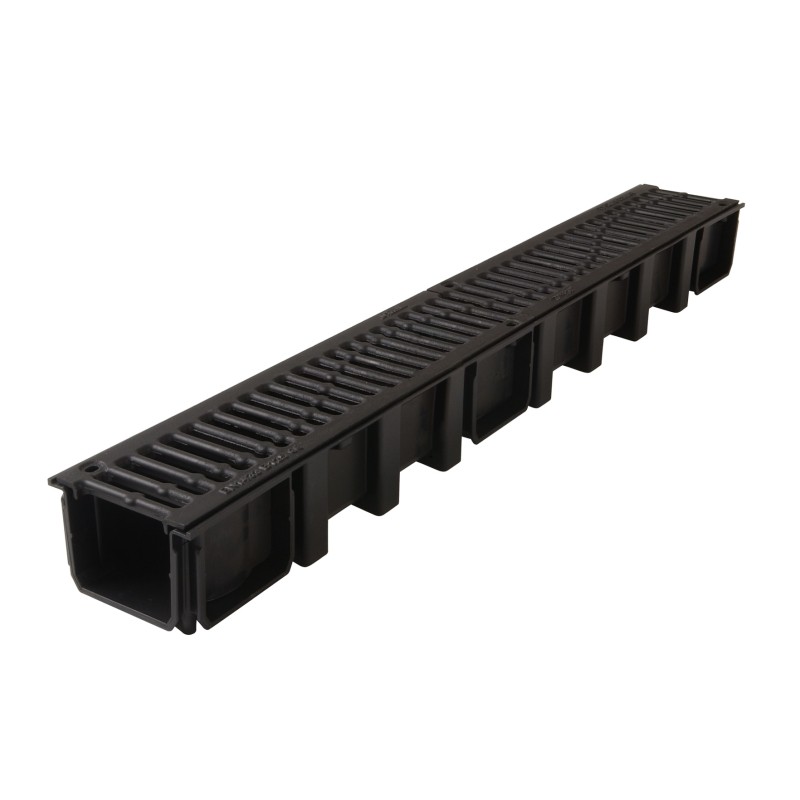 1 m caniveau en PP noir - Largeur 130 mm - 2 grilles fonte vissées